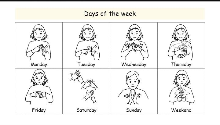 American Sign Language Days Of The Week Printable – The Morning Logon child indication words appears like direct sunlight increasing over the horizon. To teach the indication, lay down your low-superior palm flat facing your body, together with your superior arm’s elbow sleeping on it. Together with the remaining fingers of the prominent fingers, come up with a fist and make up the letter D, or “time” in ASL. Sweep straight down to your low-dominating forearm, tracing the arc along with your index finger. You can even present differences towards the area around the hands. American Sign Language Days Of The Week Printable.